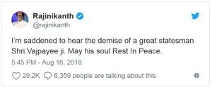सुपरस्टार रजनीकांत ने कहा है कि महान राजनेता और आदर्श व्यक्ति श्री अटल बिहारी के निधन की खबर सुनकर बहुत दुखी हूं। भगवान उनकी आत्मा को शांति प्रदान करे। प्रियंका चोपड़ा ने अटल बिहारी वाजपेयी के योगदान को देश के लिए अतुलनीय करार देते हुए लिखा है कि देश उन्हें हमेशा याद रखेगा। मेरी सांत्वना उनके परिवारवालों के साथ है।