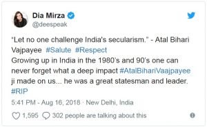 दीया मिर्जा ने लिखा है, ‘भारत की धर्मनिरपेक्षता को कोई चुनौती नहीं दे सकता।’ – अटल बिहारी वाजपेयी। उन्हें सलाम। अस्सी और नब्बे के दशक के दौरान भारत में बड़ा होना कोई कैसे भूल सकता है कि उस वक्त हमारी जिंदगी पर क्या प्रभाव पड़ा था। वे एक महान राजनेता थे। वहीं, वीर दास ने लिखा, चाहे आप उनसे सहमत हों या नहीं हों, मगर उनकी नेतृत्व की क्षमता, उनके विचार और उनकी बोलने की क्षमता का तो सम्मान हर किसी को करना पड़ा।