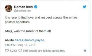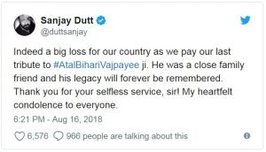 संजय दत्त ने भी अटल बिहारी वाजपेयी को श्रद्धांजलि देते हुए लिखा, वास्तव में हमारे देश के लिए यह बहुत ही बड़ा नुकसान है। हम अटल जी को यह अंतिम सलामी दे रहे हैं। अटल जी हमारे बेहद करीब थे। उनकी विरासत हमेशा याद रहेगी। आपकी इस सेवा के लिए बहुत-बहुत धन्यवाद। मेरी सांत्वना सभी के साथ हैं। बोमन ईरानी ने लिखा कि राजनीति के क्षेत्र में प्यार और सम्मान पाना बड़ा ही दुर्लभ है। अटल जी इन सभी में एकदम दुर्लभ थे। अलविदा अटल बिहारी वाजपेयी।