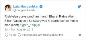सुर साम्राज्ञी लता मंगेशकर ने वाजपेयी को श्रद्धांजलि अर्पित करते हुए ट्विट किया, ऋषितुल्य पूर्व प्रधानमंत्री भारत रत्न अटल बिहारी वाजपेयी जी के स्वर्गवास की वार्ता सुनके मुझे ऐसा लगा जैसे मेरे सिर पर पहाड़ टूटा है, क्योंकि मैं उनको पिता समान मानती थी और उन्होंने मुझे अपनी बेटी बनाया था। मुझे वो इतने प्रिय थे कि मैं उनको दादा कहके बुलाती थी। आज मुझे वैसा दुख हुआ है जैसे मेरे पिता जी के स्वर्गवास के समय हुआ था। ईश्वर उनकी आत्मा को शांति दे।